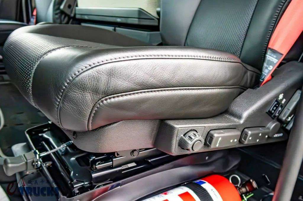 为什么说这台FH Aero是顶配车型呢?上了车你就知道了。首先是每日和驾驶员打交道最多的座椅,他采用了真皮饰面,带有缝线,还进行了通风打孔,结合红色安全带,塑造更高的豪华感。像通风、加热这种功能都是一应俱全,前后俯仰等方向调节也是应有尽有,供驾驶员找到舒适的坐姿。