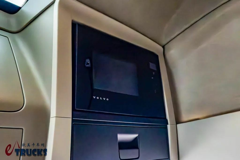在长途行车过程中,吃饭这件事可是至关重要的。这台沃尔沃FH Aero选装了原厂提供的集成式微波炉系统,它安装在车顶储物柜内部,并通过原厂逆变器供电,可用来加热冷冻、冷藏餐食。这套配置的价格还是比较高的,因此选装它的人并不多。