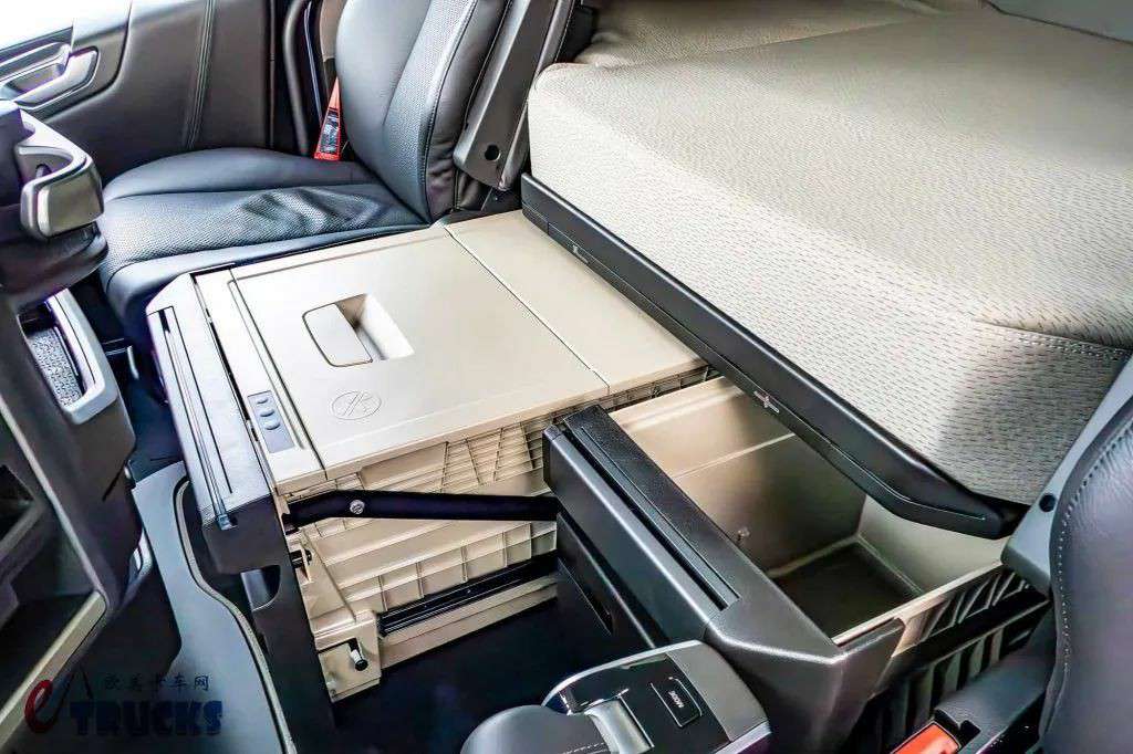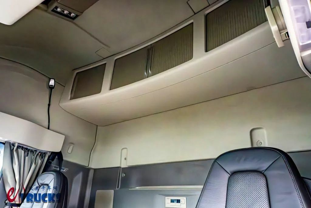 而在驾驶室方面,本车采用了沃尔沃Globetrotter XL型高顶带卧铺驾驶室,这款驾驶室也是除XXL加长后壁驾驶室外,沃尔沃FH Aero可选尺寸最大的驾驶室。该驾驶室的内部净高达到2米左右,并有着充足的储物空间,可为两名驾驶员提供舒适体验。得益于超大驾驶室空间,本车还采用了上下双级储物舱。上级用来放置大件物品,下级放点手套之类的杂物,非常的方便。
