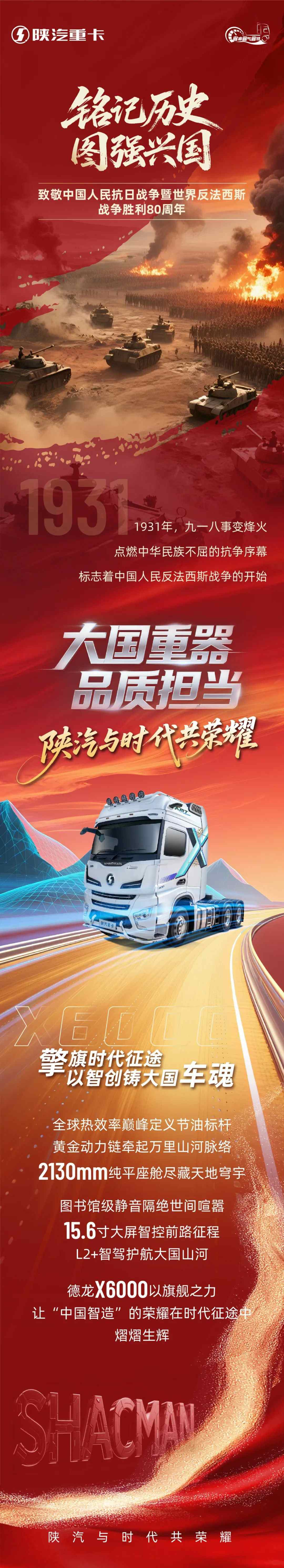 擎旗时代征途 以智创铸大国车魂——陕汽重卡致敬中国人民抗日战争暨世界反法西斯战争胜利80周年 张赫 企业快讯, 卡车2025年8月20日 17:205.23W0 陕汽重卡(601)本文来源企业提供,经授权后由张赫发布,观点不代表提加商用车网的立场,转载请联系原作者。张赫4.96K474.39M55.77W