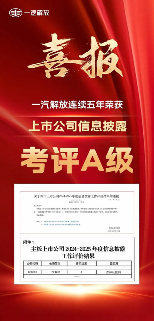 近日,深圳证券交易所发布《主板上市公司2024-2025年度信息披露工作评价结果》显示,一汽解放获得最高等级A级评价。这是一汽解放连续5年获得该类评价,体现了监管机构对公司治理水平、规范运作能力的高度认可。