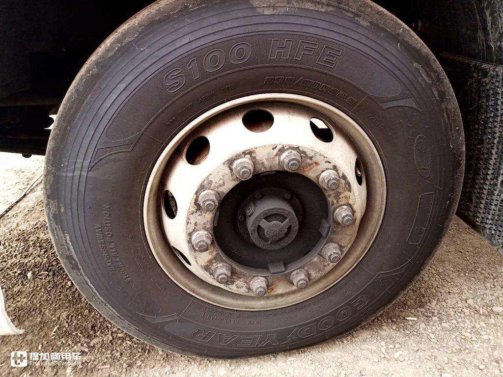鼓式制动转向桥采用“康迈”免维护油润滑轮端口,钢制轮毂配有尺寸为295/80R22.5的固特异轮胎。