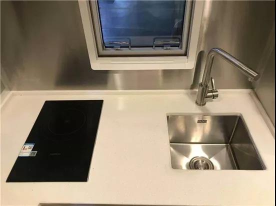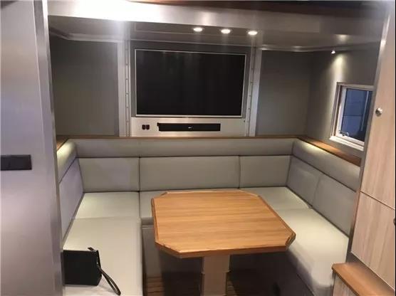 越野房车内部也是相当豪华的,厨房、嵌入式冰箱、油烟机、嵌入式液晶电视、干湿分离淋浴间、电吸马桶、U型沙发以及吊床等等,您能想到的日常生活用具,在这辆越野房车的车厢里都能找到。