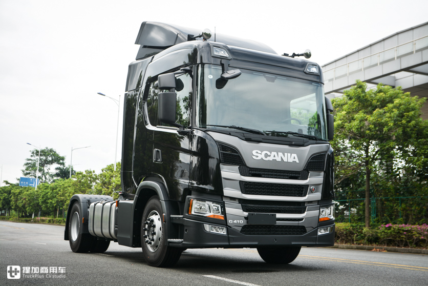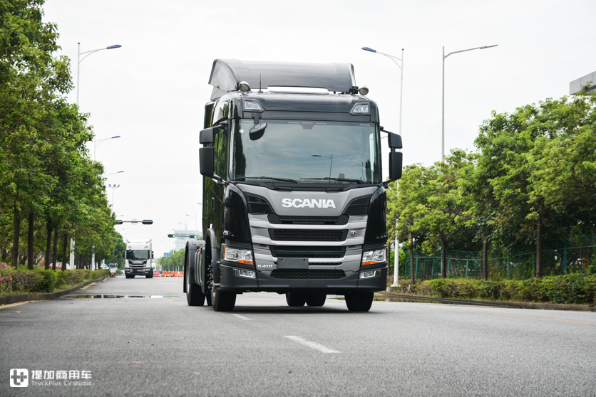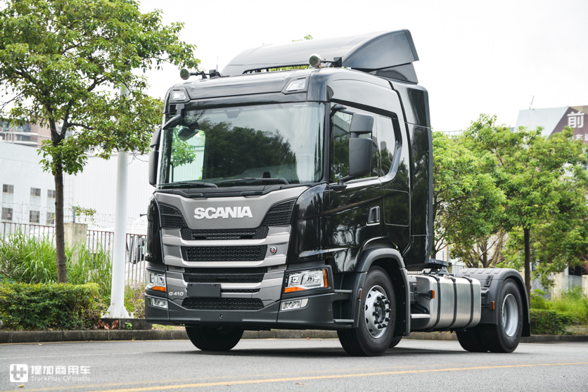 刚好最近看到一批斯堪尼亚G410牵引车,4x2驱动形式和黑色的外观,没猜错的话是某快递公司定制车,大公司买进口车抠不抠门,看这辆车就能知一二了。