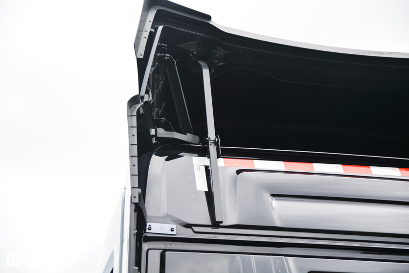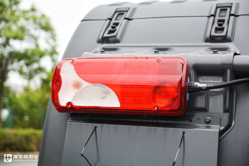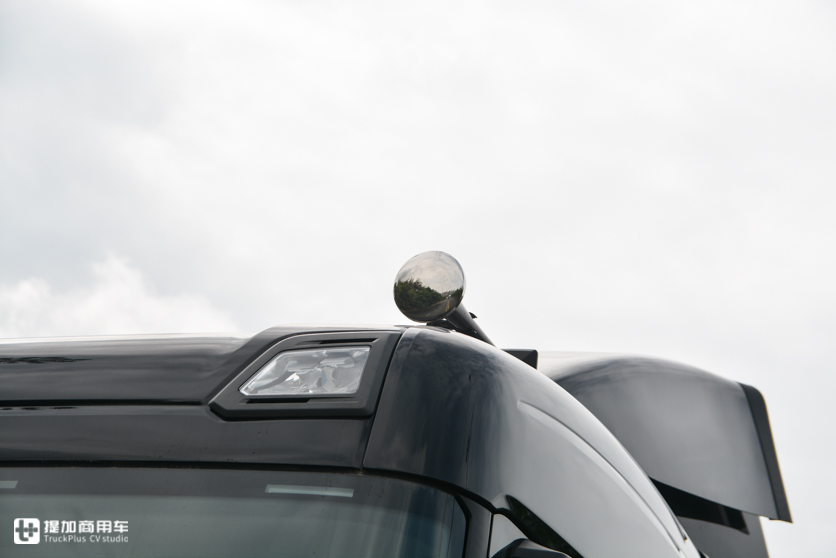 有顶部和侧面导流罩的存在,匹配快递挂车倒没有什么问题。顶部的导流罩高度可用调节,但没有快速调节功能,配置高一点的会配一个摇把,站在驾驶室后面就能快速调节导流罩高度。更高级的配置是电动调节导流罩高低,驾驶员在车里动动手指就行。