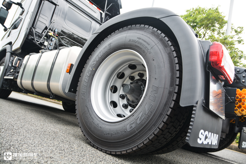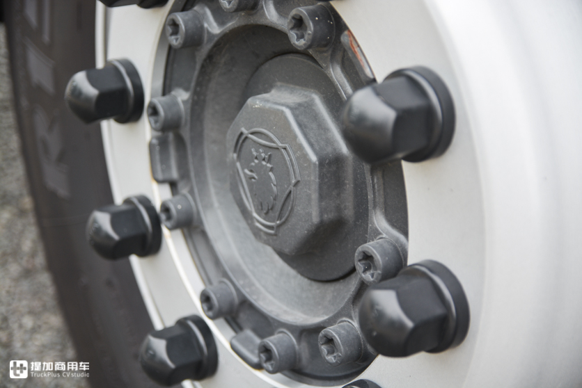 前轮的没有螺丝防护罩,可以看到斯堪尼亚标志性的轴头,上面有一个斯堪尼亚狮鹫标志。