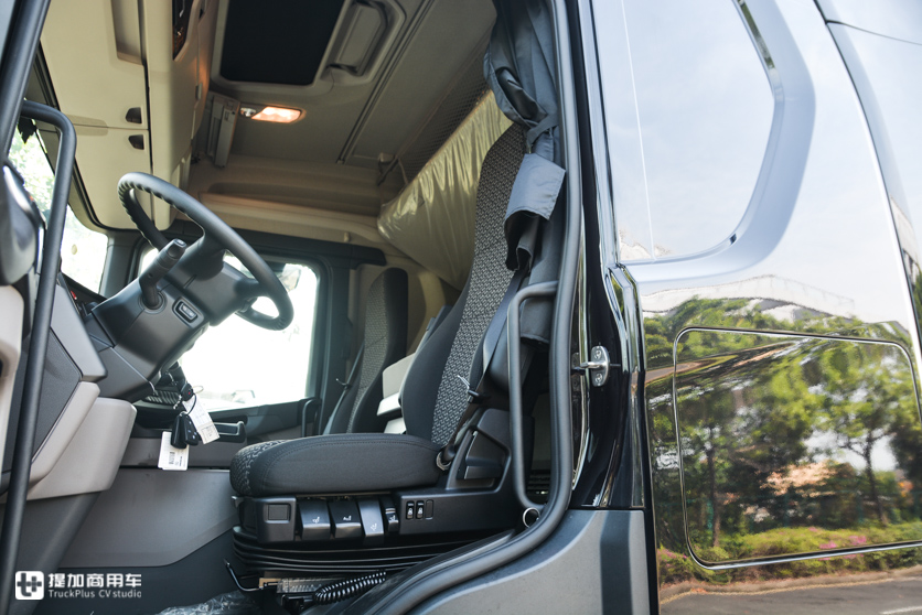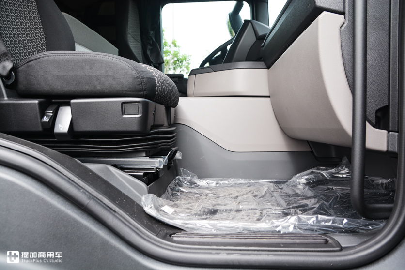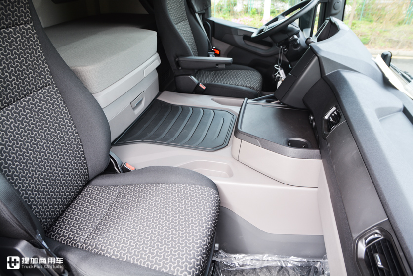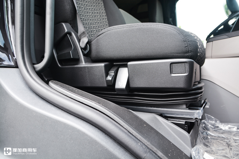副驾驶座椅配置稍微低一些,但也是气囊减震座椅,支撑快速充放气和座椅高度调节功能。两个驾驶员轮换开车的时候,坐在副驾驶的人舒适性也能得到保证。