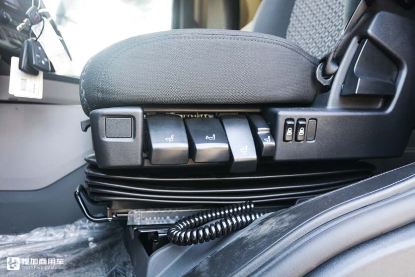 外部配置虽然寒酸了一点点,主副驾驶座椅配置却不低。主驾驶气囊减震座椅侧面一排调节按钮,可以调节减震阻尼、座椅前后仰角、座椅高度、快速充放气、腰部支撑、坐垫长度等功能。