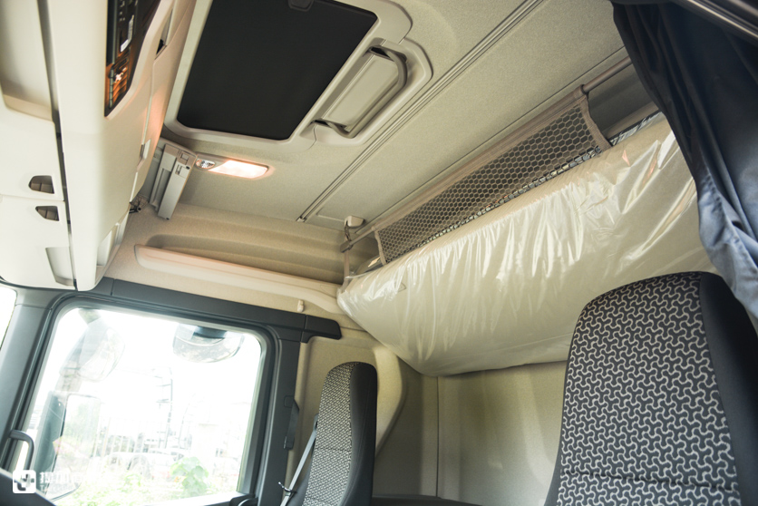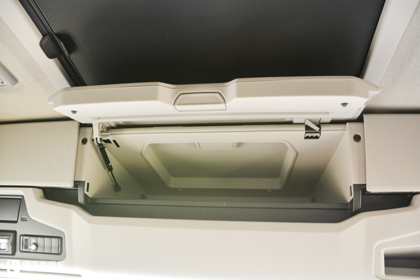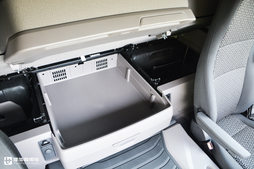 标准顶和高顶驾驶室的区别就是挡风玻璃之上的高度差异,标准顶的高度相对低矮一点,带来的连锁反应就是顶部储物空间的不足。三个储物箱的高度空间都不大,要放几件衣服进去都有点费劲。作为低配车,储物箱内也没有照明灯光。