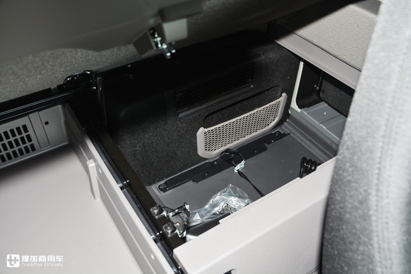 下卧铺在功能细节上做的也很到位,按压开关就能掀起下卧铺,液压支撑杆会自动撑住卧铺,不用人再去扶住它。卧铺下方有3段储物空间,主驾驶座椅后面那一段与车外箱门连通,可以从车外存放物品进去。中间的空间是一个抽屉,抽拉就能存放物品。副驾驶后面一段储物空间不与外部连通,只能掀起卧铺才能存放物品。