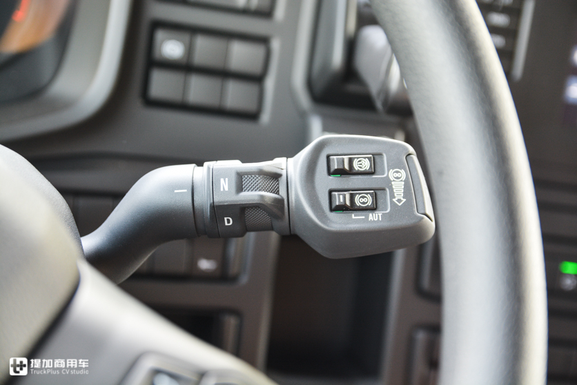 变速器的选档通过方向盘下面的拨杆完成。在这个拨杆上集成了液力缓速器操作开关,变速器后面的斯堪尼亚惯性滑行式液力缓速器R4100D最大制动力矩4100Nm,应该是国内能买到最强制动力的液力缓速器。