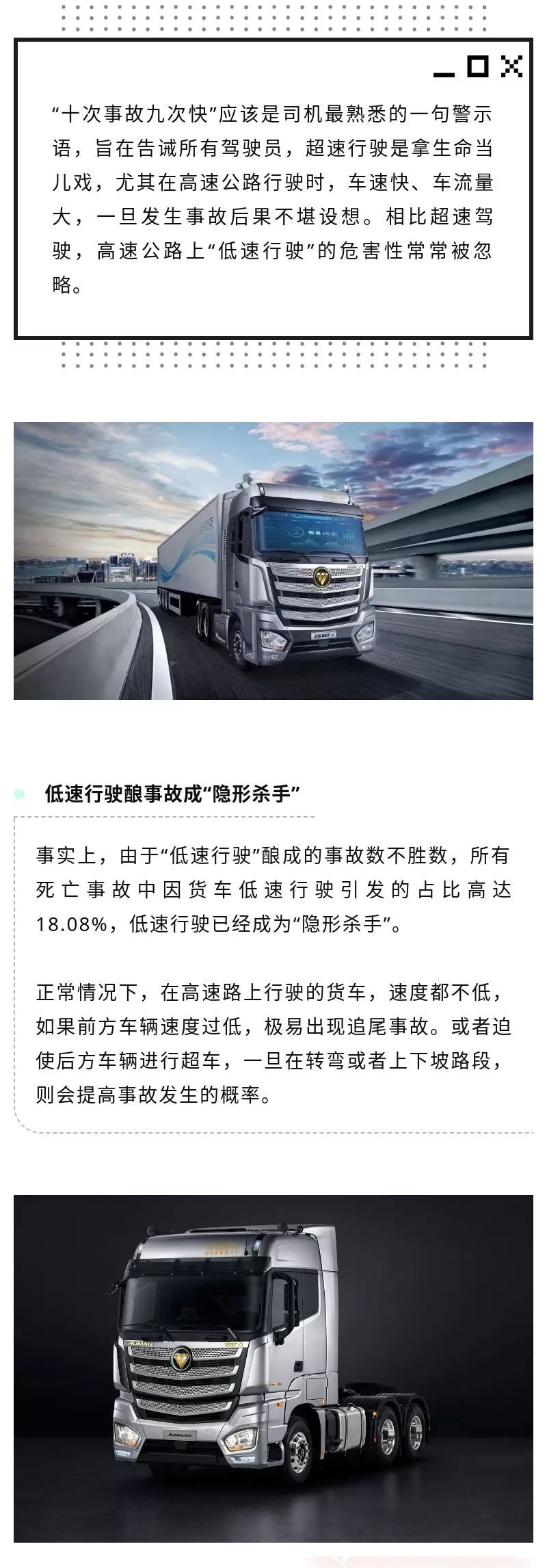 高速上开车 低速行驶竟潜藏诸多危险! 编辑张靖 养车用车, 卡车2019年9月8日 09:089.51W0 欧曼(62)福田戴姆勒汽车(110)本文来源福田戴姆勒汽车,经授权后由编辑张靖发布,观点不代表提加商用车网的立场,转载请联系原作者。编辑张靖提加商用车小编,还请大家多指教!6.22K939.19M39.62W