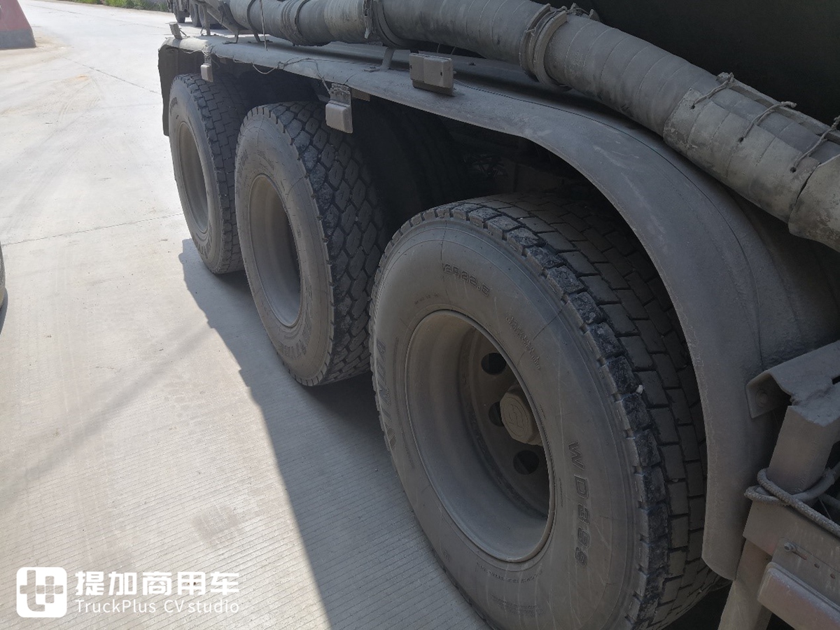 挂车,普通的水泥槽罐车,但是用的轮胎让我有点奇怪,大部分用的是麻将块的花纹,少部分用斜花纹的,初步估计应该是驱动轮退休下来的轮胎,块状花纹滚阻大,可能会稍稍增加油耗,但是也会缩短一定的刹车距离。