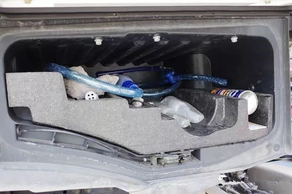 格尔发K7的储物空间很大,每一侧有两个储物柜,上图是驾驶侧的下方储物,只能从外部打开,主要用来存放随车的一些工具,上方来有两个很大的储物柜,位于卧铺下方,也可以从驾驶室内部打开。