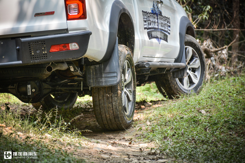 面对这样比较恶劣的环境,在2H模式下,也就仅后轮驱动模式,帅铃T8居然能顺利走完整个赛道,只在交叉轴路段轮胎出现了轻微打滑,由此可见帅铃皮卡的越野潜力不小,切换到4H或4L模式,这条越野赛道很轻松就能完成。底盘扎实是一方面原因,动力强劲则是另一个原因。
