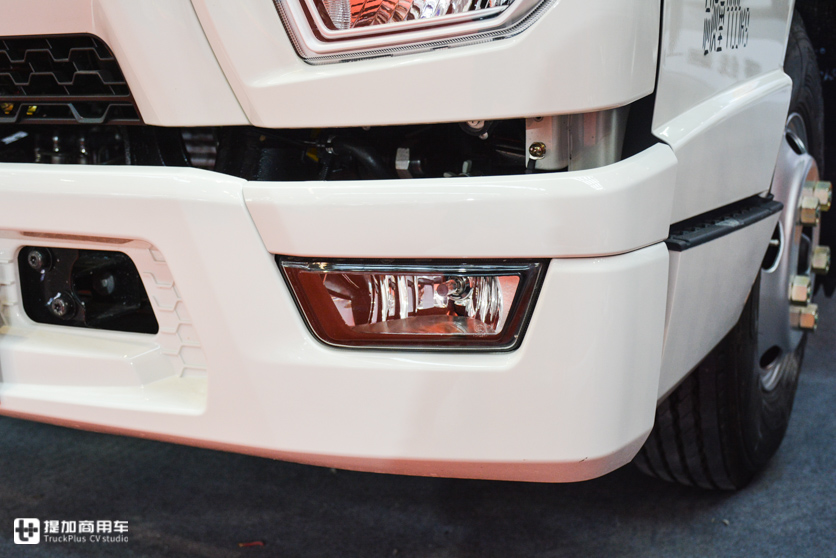 江铃顺达国六车的外观变化很多人一时之间都难以接受,前脸设计不如老款简洁,要素太多,特别是窄体驾驶室让整个前部造型看上去更为拥挤。但是从细节上看,精致度要比之前提升很多,如雾灯边缘熏黑的设计,细小的接缝等。