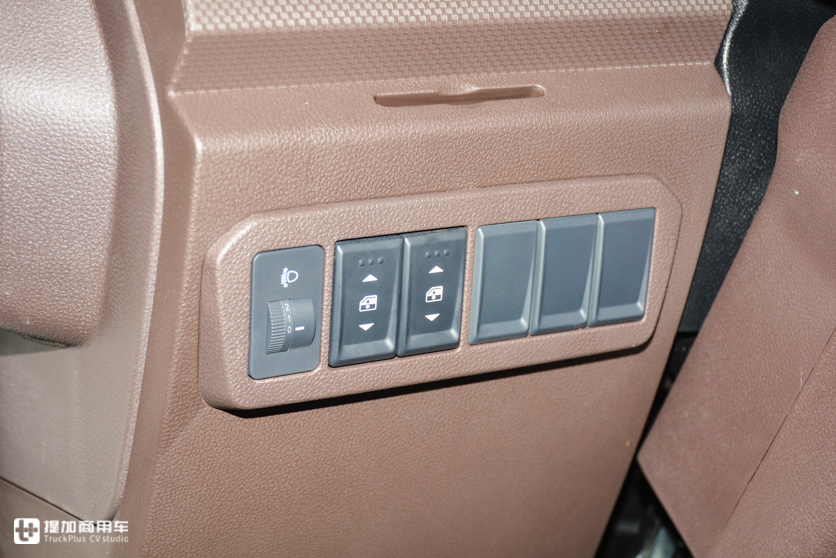 转向柱右侧的两个车窗升级按钮值得一说。以前双排座轻卡前排主副驾驶有电动玻璃升降,但是第二排都是手摇升降,顺达国六车为后排也装上了电动玻璃升降,这两个按钮就是让驾驶员控制后排玻璃升降的。后排门板上也有单独的按钮让乘客控制玻璃升降。
