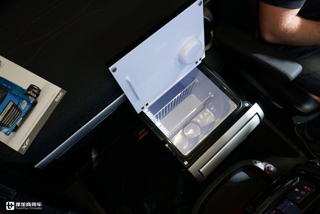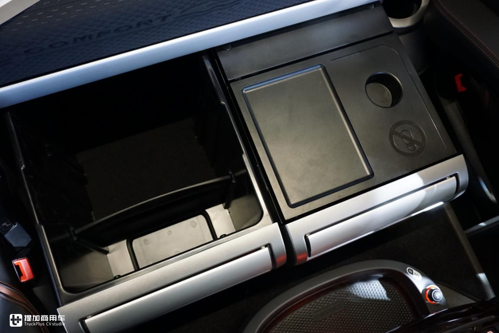 卧铺下方有两个储物格,其中靠近驾驶员一侧的是车载冰箱,车载冰箱的盖子上有一个iPad大小的凹槽,可以放一些小文件,还有一个进深不算深的杯座。靠近副驾驶一侧的储物格有挡板把储物格分成两个部分,方便驾驶员放置不同的物品。