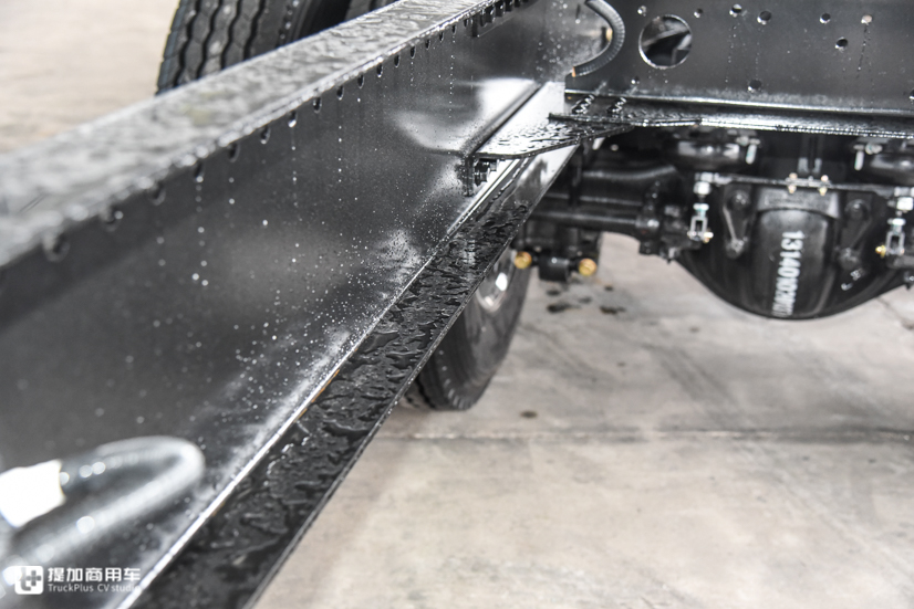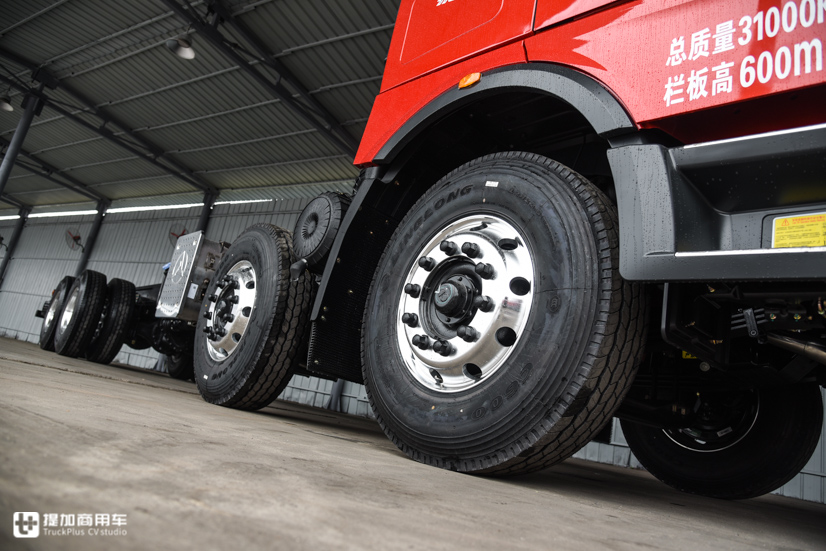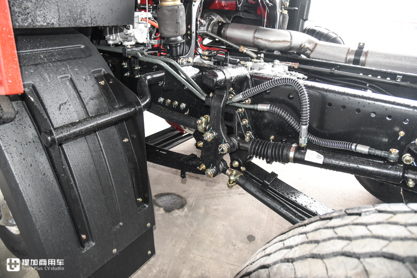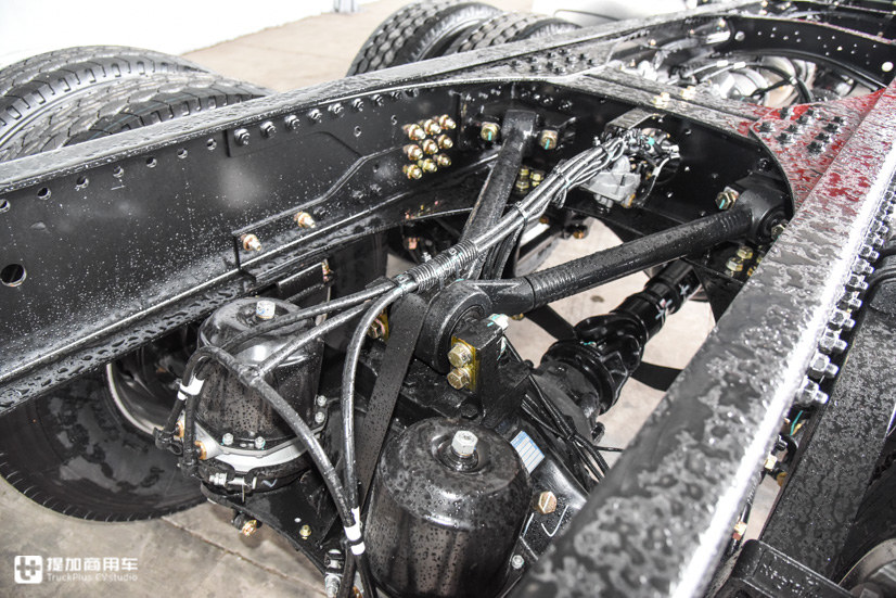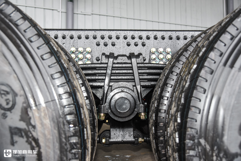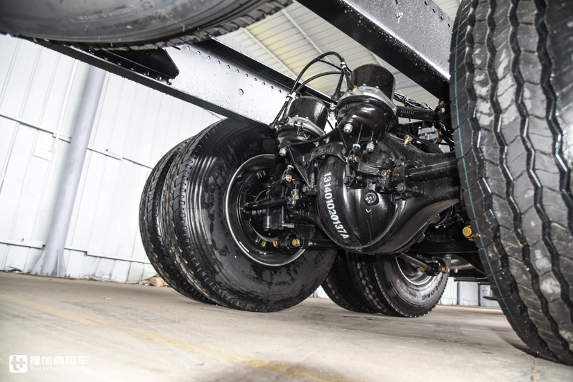 传统的减震配置还有悬架,前面两条轴是三片钢板,后面是四片钢板,标载运输承载能力足够。