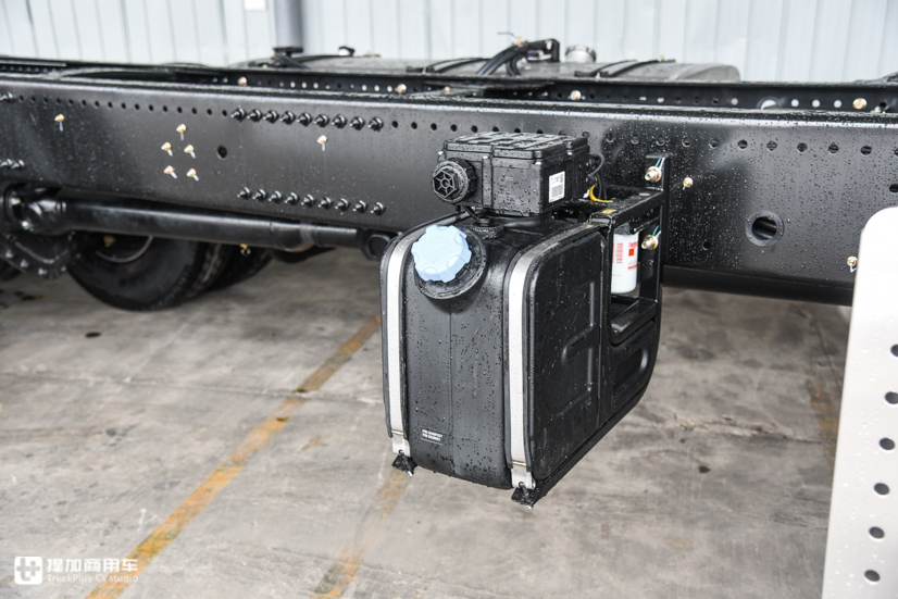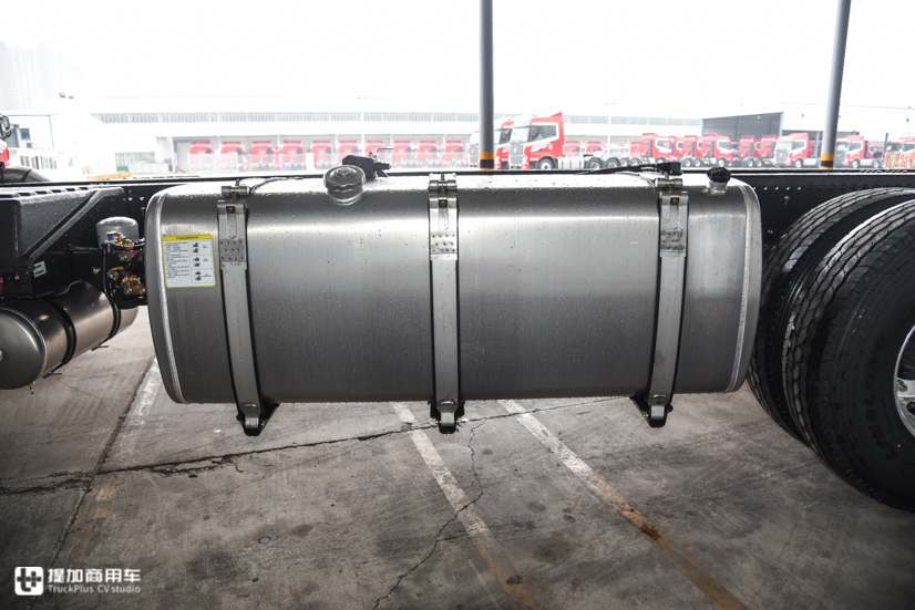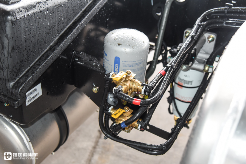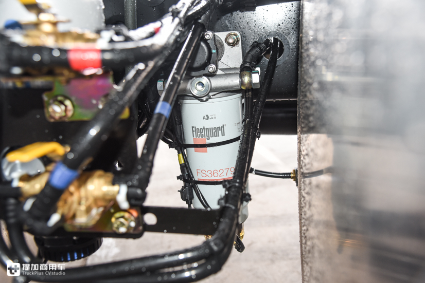 底盘配置上也是有非常多的亮点,比如底盘左侧的油箱,容量是700+100升,大的主油箱加一个小容量的副油箱共同组成800升的油箱。通过这种主、副油箱的搭配加上阀体的切换,在冬天的时候我们就可以大油箱加0#柴油,小油箱加负标号的柴油,利用水加热循环冬天也能够用0#柴油了,节约冬季的用车成本。