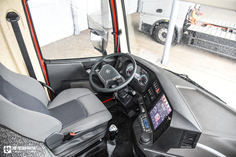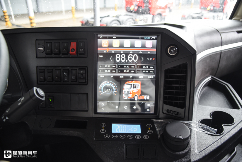 驾驶室里我们能看到很多配置其实都不算低,甚至跟牵引车差不多。驾驶员天天要握着的方向盘左右两边都是多功能按键,左边是定速巡航控制按键,右边是多媒体的控制,主要控制中控大屏。