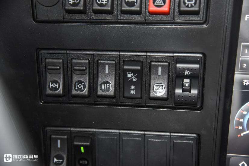 在实用性的功能配置上除了常规的电动玻璃升降还有电加热的后视镜,有一个单独的控制按键。整体来讲车内的基础性配置和舒适性配置都是非常高的,作为互联网重卡它还有一项功能就是车载WiFi,车上有一个Wifi开关,按一下之后就打开了。手机就能连上车内发射的WiFi热点,平时咱们上网娱乐用这个热点能省自己的一些流量。