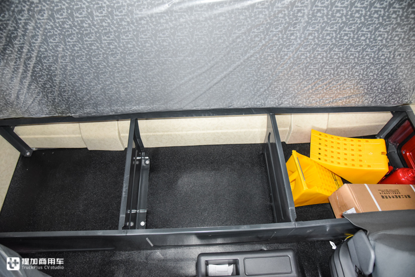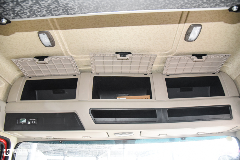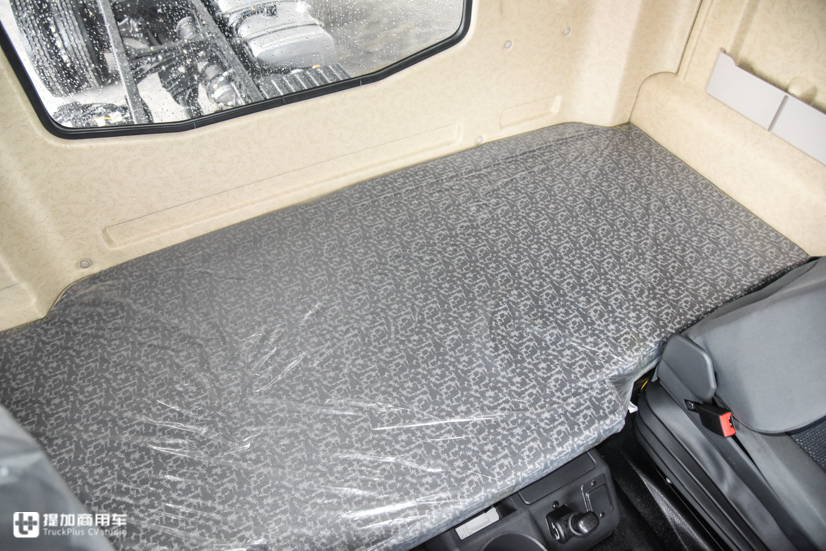 驾驶室内整体的空间跟牵引车没啥区别,中间平地板的设计,载货车里面来讲这个空间是属于非常大的。顶部的储物空间也做得不错,虽然卧铺没有牵引车那么宽,但是它这个卧铺宽度也有90多厘米,这个数据不管是在牵引车或者是在载货车上面都是属于大卧铺的配置。