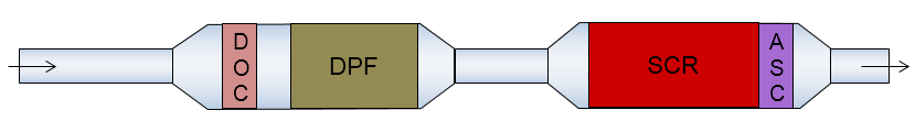 看上面两幅图,可以看出国五的后处理系统有SCR,国六的后处理系统除了SCR外,还多了ASC、DPF、DOC三大装置,(其中SCR为选择性催化还原,DOC为氧化型催化器、DPF为壁流式颗粒捕集器、ASC为氨气氧化催化器)。