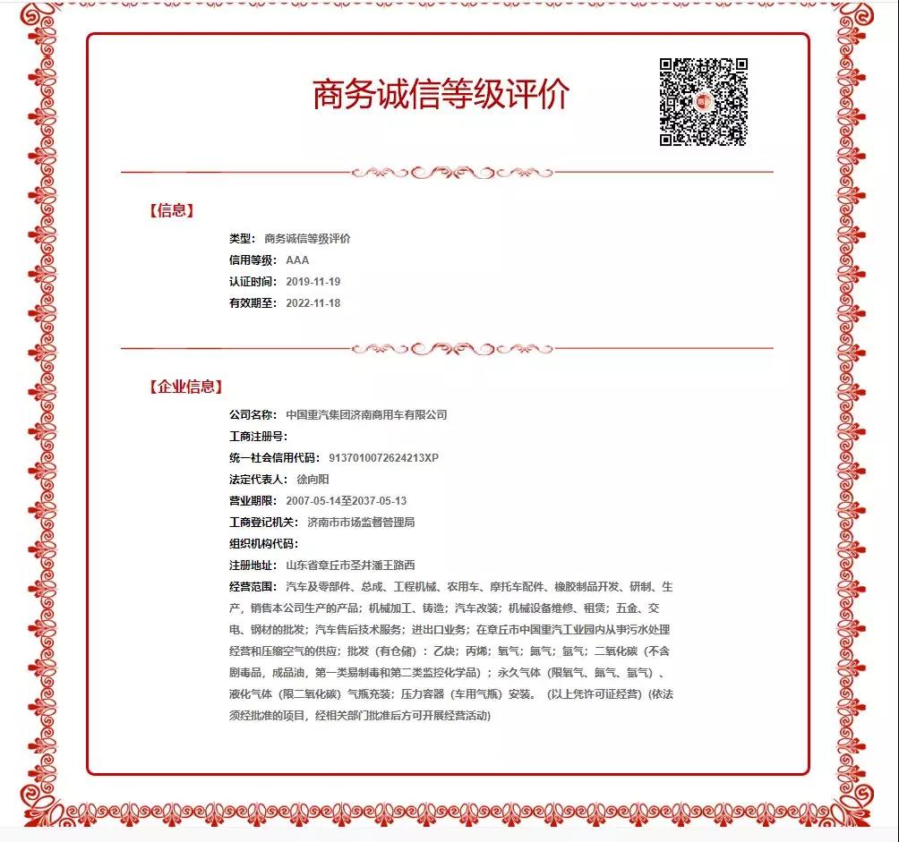 2019年11月19日,中国重汽集团济南商用车有限公司顺利通过“企业商务诚信等级评价”认证,荣获 AAA奖。