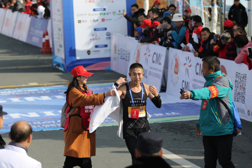 志愿者为全马组冠军获得者秦鑫灏披上毛巾
