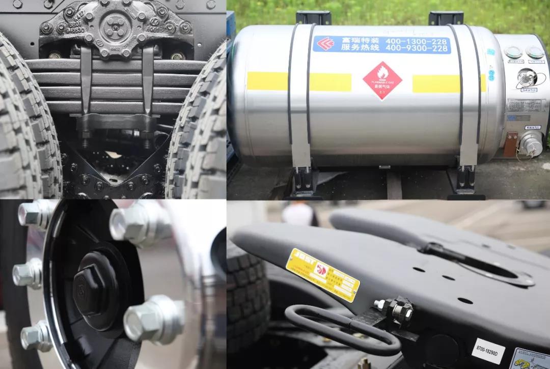 其车架横梁总成采用高强度材质610L ,伸梁材质QT800,质量可靠令人安心;车架连接孔位进行了标准化改造,50mm的孔距改善了受力分布,减少了应力集中;车辆底盘零部件采用强度10.9级的法兰盘螺栓,与车架连接后提升了连接强度;悬架前板簧端部结构优化,卷耳部分采用免维护橡胶衬套,可靠性进一步提升。