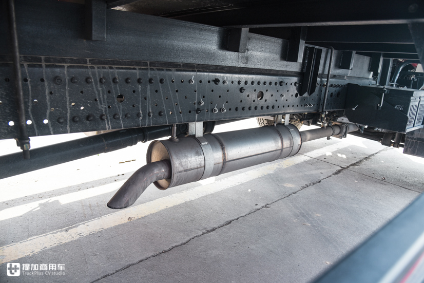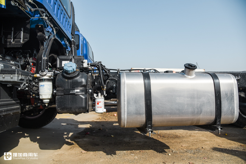 尿素箱和油箱等都布置在车架左侧,铝合金油箱容量200升,能保证续航里程做到1000+公里,减少中长途运输过程中的加油次数。