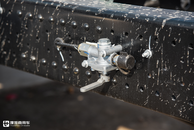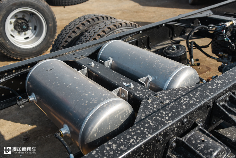 铝合金储气筒和干燥罐全部都放在了车架内侧,不过江淮在车架左侧预留了一个取气接口,带手控阀,要接风枪或者气管给轮胎应急补气都很方便。
