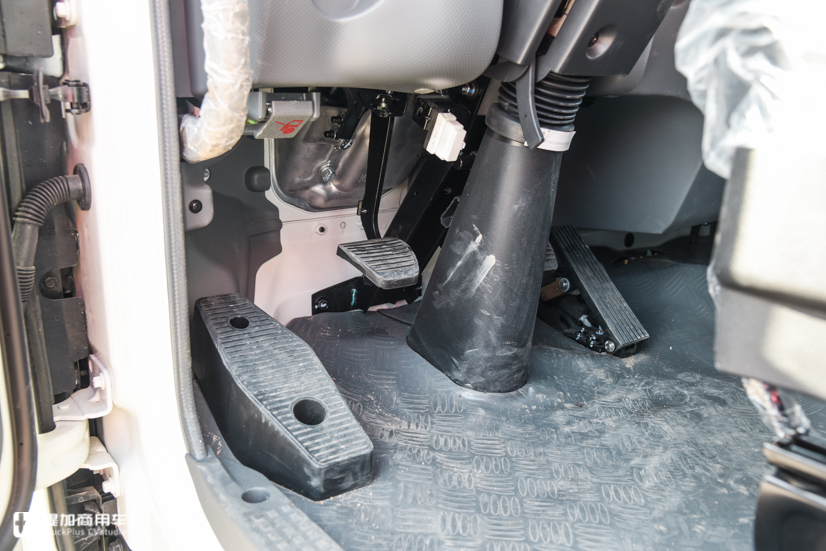 底盘右侧留足了空间给用户改装淋水器或者工具箱,纵梁上预留了大量的标准孔位,加装这些东西可以直接拧螺丝,不需要在车架上打孔或者焊接。