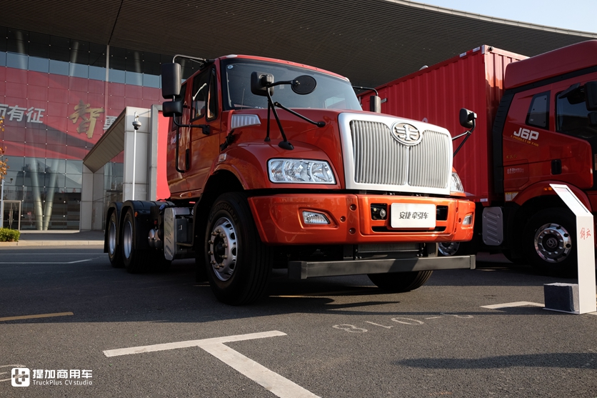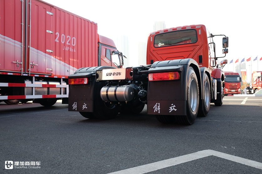 欧洲流行的低鞍座牵引车在国内一直很罕见,国产车也鲜有相应产品。解放JH6展出的低鞍座牵引车就是一款少见车型,牵引鞍座离地高度仅95cm,比普通牵引车鞍座高度要低30-40cm左右。更低的鞍座高度意味着挂车高度可做的更高,增加载货空间,快递等轻抛物运输市场会有这方面的需求。