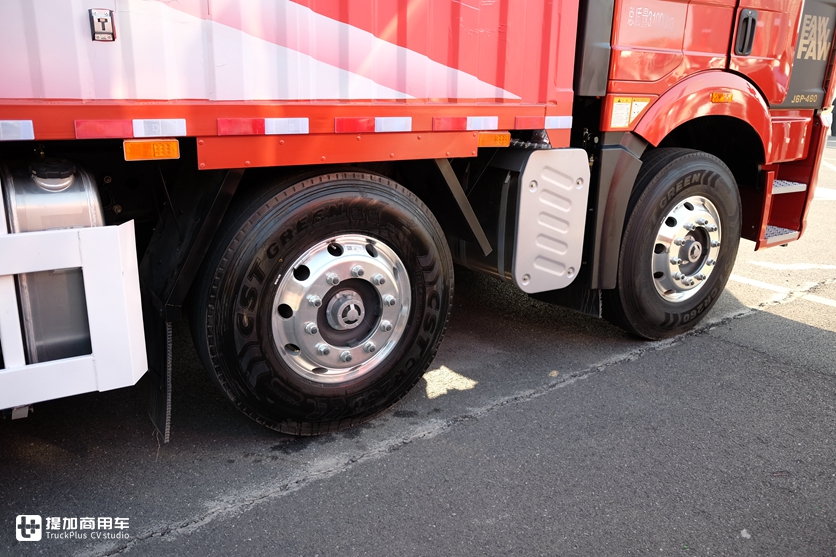 降低底盘高度的方法和牵引车差不多,全车都采用295/60R22.5轮胎,铝合金轮圈。两条前轴盘刹,后轴楔式制动器(鼓刹)。轮胎缩小之后,驾驶室和车架之间的高度并没有降低,轮胎上方与驾驶室之间就有了很大的空隙。