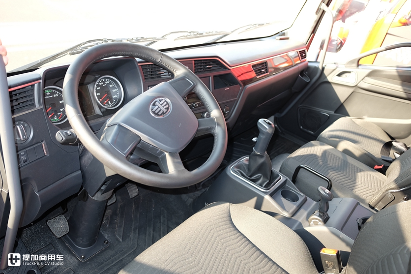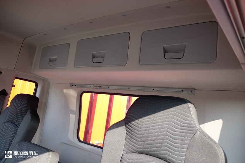 半高顶设计空间介于平顶和高顶驾驶室之间,车内空间充裕,横向布置3个座椅。中控台的设计也让让人眼前一亮,比较小的中控台尺寸使得车内空间得到了最大化利用,各种材料的搭配营造了不错的品质感。