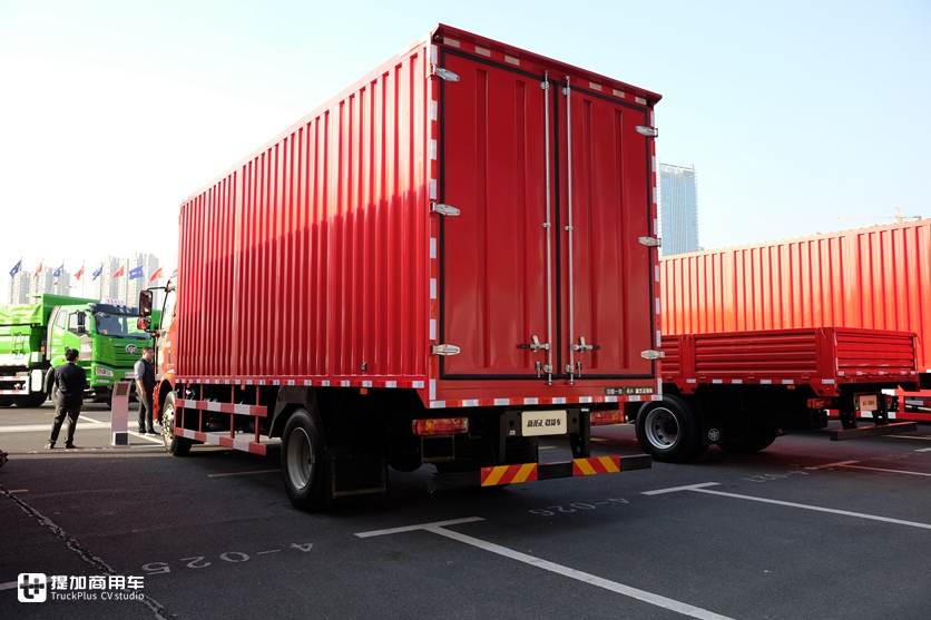 对,还是JH6。载货车领域,JH6也做了一款超低底盘的车型,虽然底盘没有低鞍座牵引车那么夸张,不过对比其他载货车还是有很明显的高度差距。车架离地高度仅有980mm,货箱内高2.6米,可以增加2.8m³货箱容积。