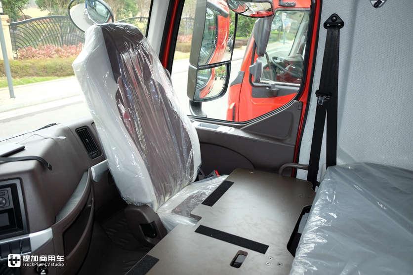 不过在拓宽卧铺之前需要把副驾驶座椅旋转180度,腾出座椅靠背阻碍的空间。因此这款乘龙H5中卡额外多了一项副驾驶座椅旋转功能,即便不加宽卧铺,也可以让座椅旋转90度,副驾驶的人可以躺的更惬意。