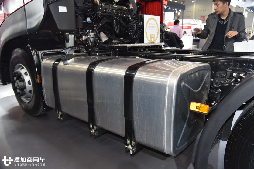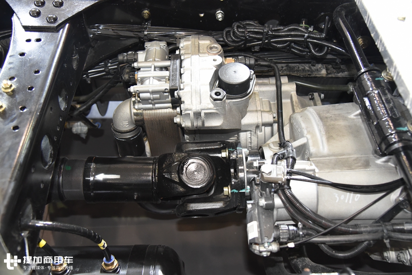 而车架右则依次安装了后处理系统和堆叠式储电池。此外,为了节省一部分车架空间,蓄电池后面的空间还是被预留出来,用以匹配四季版的低标号油箱,尿素系统则被安装在后处理上面。