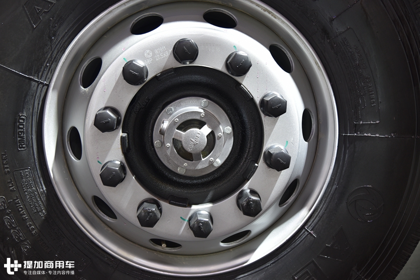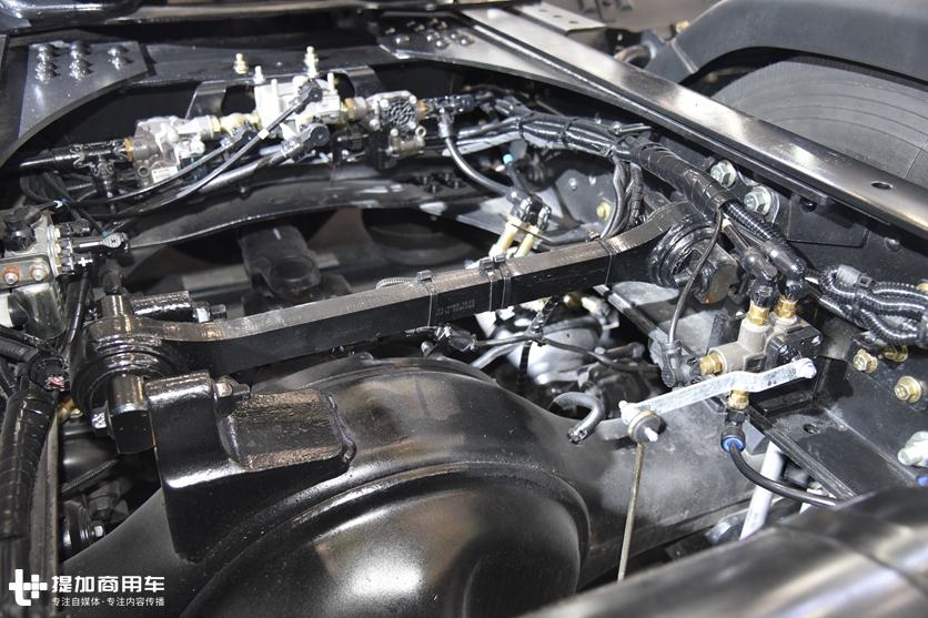 车桥采用的是东风德纳车桥,前桥5.5T(少片簧),轮端是康迈油润滑轮端,免维护;6x4驱动桥吨位10T,和前桥一样,同样免维护。