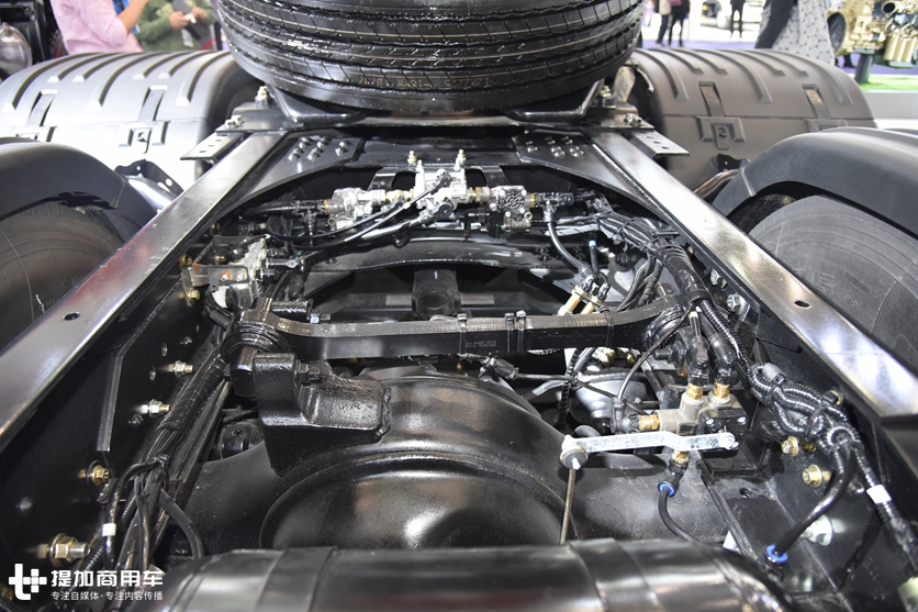 不同的是,驱动桥悬挂系统采用了空气悬挂,美国品牌瀚瑞森,品质的保障。另外,该空气悬挂系统不同于传统的8气囊或9气囊空气悬挂,而是4气囊悬挂,结构是在每根车桥前半部分依然是钢板簧,后半部分才是两个气囊,两根车桥共计4个气囊。这种悬挂系统近年来已经得到普遍装配,包括斯堪尼亚卡车在内都在使用该形式的空气悬挂系统,而该系统的优势在于既保证了车辆的承载能力,又兼顾了舒适度。