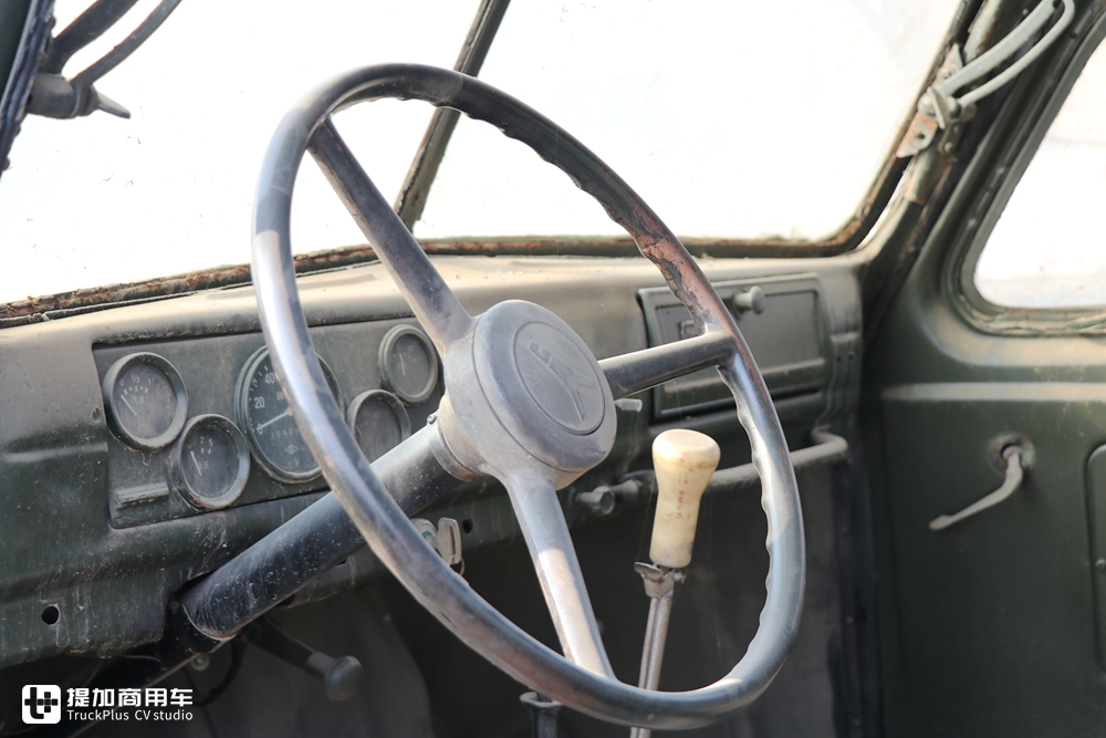 铁质的三幅方向盘非常的简陋,方向盘部分区域的油漆在长时间使用后已经脱落,生出来一块块的锈迹。在方向盘中间有一个大大的“Y”字母,代表跃进。