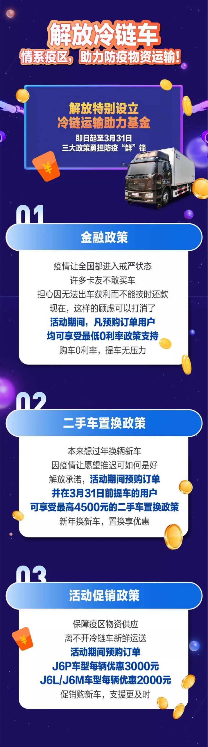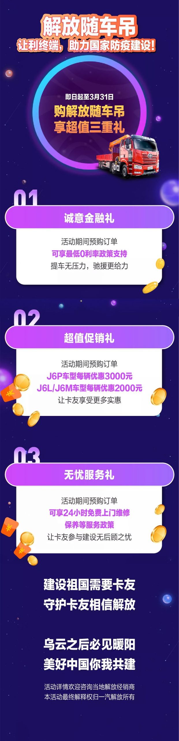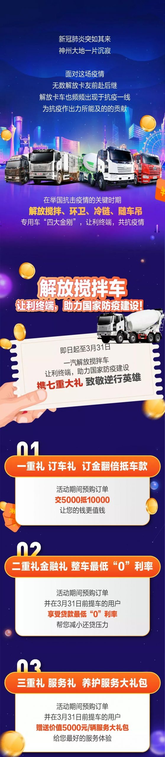 让利防疫,解放助力,专用“四大金刚”齐上阵! 编辑张靖 企业快讯, 卡车2020年2月18日 11:3811.61W0 一汽解放(539)本文来源一汽解放,经授权后由编辑张靖发布,观点不代表提加商用车网的立场,转载请联系原作者。编辑张靖提加商用车小编,还请大家多指教!6.22K941.07M39.63W