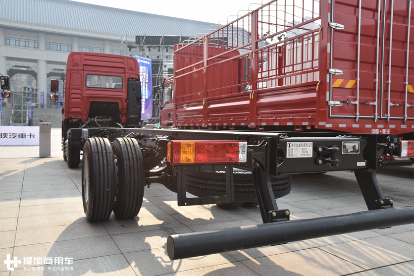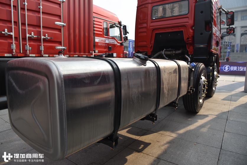 车架右侧安装了尿素罐和一个容量600L的铝合金油箱,其余位置全部为空置,方便上装厂改装,当然,用户也可根据自己的实际用车习惯来利用这些丰富的空间。