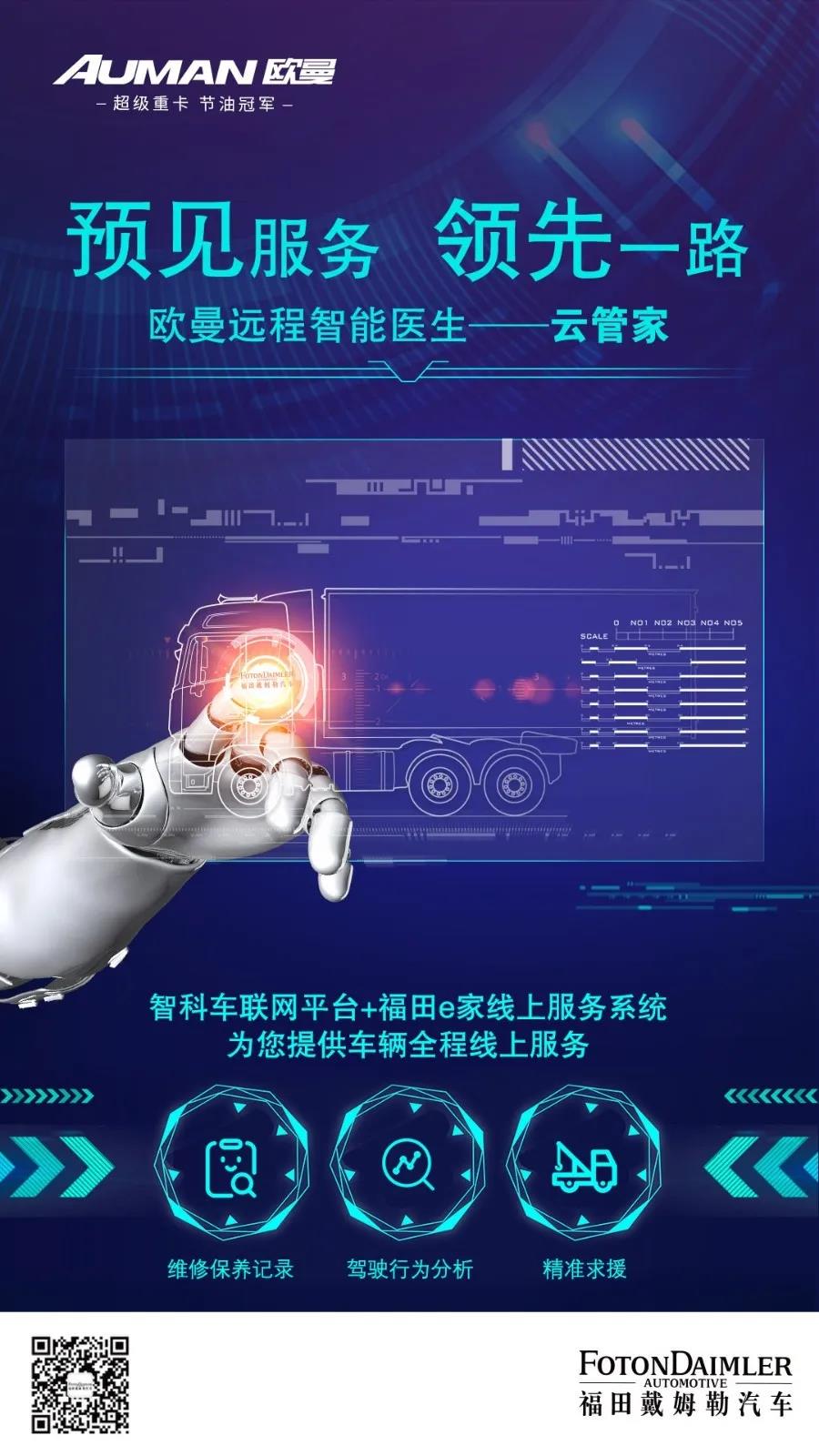 欧曼远程智能医生云管家,智能车联网加福田e家线上服务系统维修保养记录、驾驶行为分析、精准求援,为您提供车辆全程线上服务