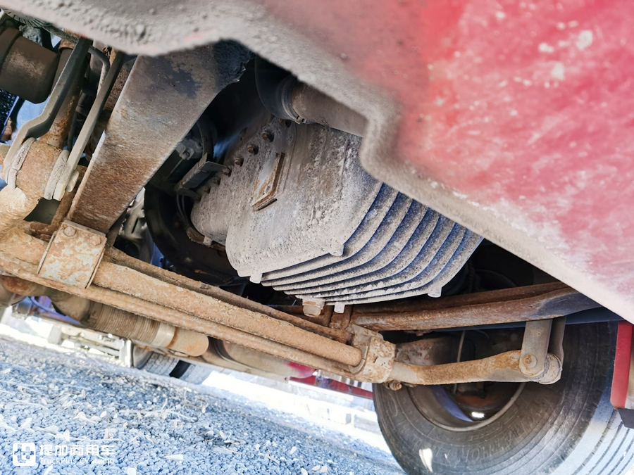 这个车的车桥是斯堪尼亚最常用的AD400SA型单级减速车桥,最标志性的就是那个尖尖的轴头。内部配的减速器应该并非国内常见的R780型2.71传动比的减速齿轮组,因为这辆车采用的是MT的变速箱,和现在的GRS905变速箱还是有一定的差距。