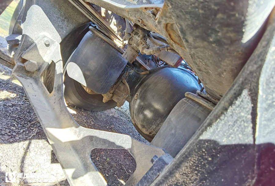 这辆车的双腔刹车气室是横向“插”在刹车上的,很明显是一个楔式制动器,这种制动器结构简单,性能可靠,成本低廉,制动力传输过程短,制动更直接,现在在解放J7上广泛应用。(日本和欧洲20年前就在用)