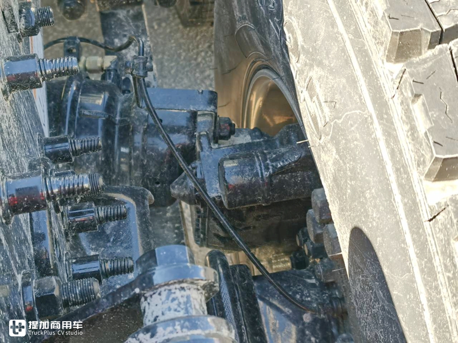 卡车的最后一桥是单胎提升桥,带有随动辅助转向功能,轮圈采用的是多孔式平口钢圈,这种欧式多孔钢圈不仅可以有效帮助车轮通风盘/刹车鼓散热,还可以稍微减轻一点自重。