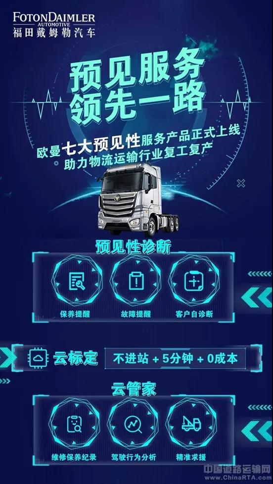 最近,欧曼重卡在业内率先推出了7大预见性服务,依托远程智能医生为用户提供更智能、更高效、更便捷的远程服务。如预见性诊断能提供保养提醒、故障提醒、客户自诊断等服务,实现故障早知道,全勤有保障;云管家借助智能车联网加福田e家线上服务系统,实时掌控车辆“身体状况”,监测车辆行驶状态;云标定(OAT)服务采用远程零成本的升级服务模式,电控模块远程升级不进站,单车标定服务只需5分钟,0成本,场景化标定数据匹配,更经济、更安全。